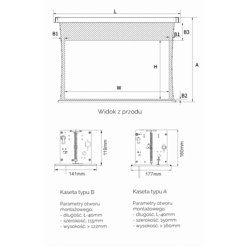 Wysokość kasety do zabudowy tylko 119mm! (dla ekranów o szerokości 280cm i powyżej – 160mm),