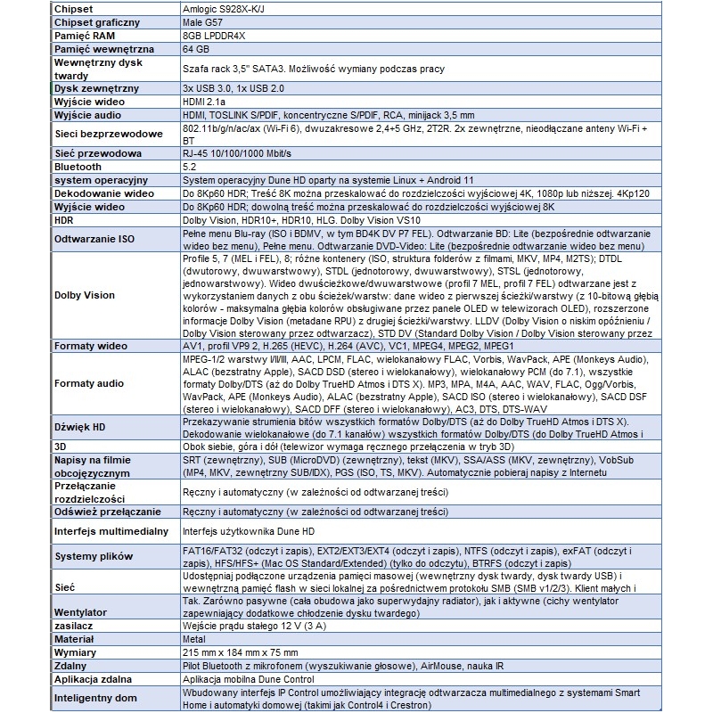 Wysoka jakość wideo 8K. Dolby Vision. HDR10+. Dekodowanie i wyjście 8K. Wydajny procesor multimedialny Amlogic S928X z 8 GB RAM i 64 GB pamięci. 1x kieszeń na dysk twardy 3,5 cala. Gigabit Ethernet. Wi-Fi 6. Bluetooth 5.2. Interfejs użytkownika Dune HD Linux + Android 11. Pełne menu Blu-Ray. Nowy pilot zdalnego sterowania DuneRemote R4 z AirMouse, Bluetooth + IR.