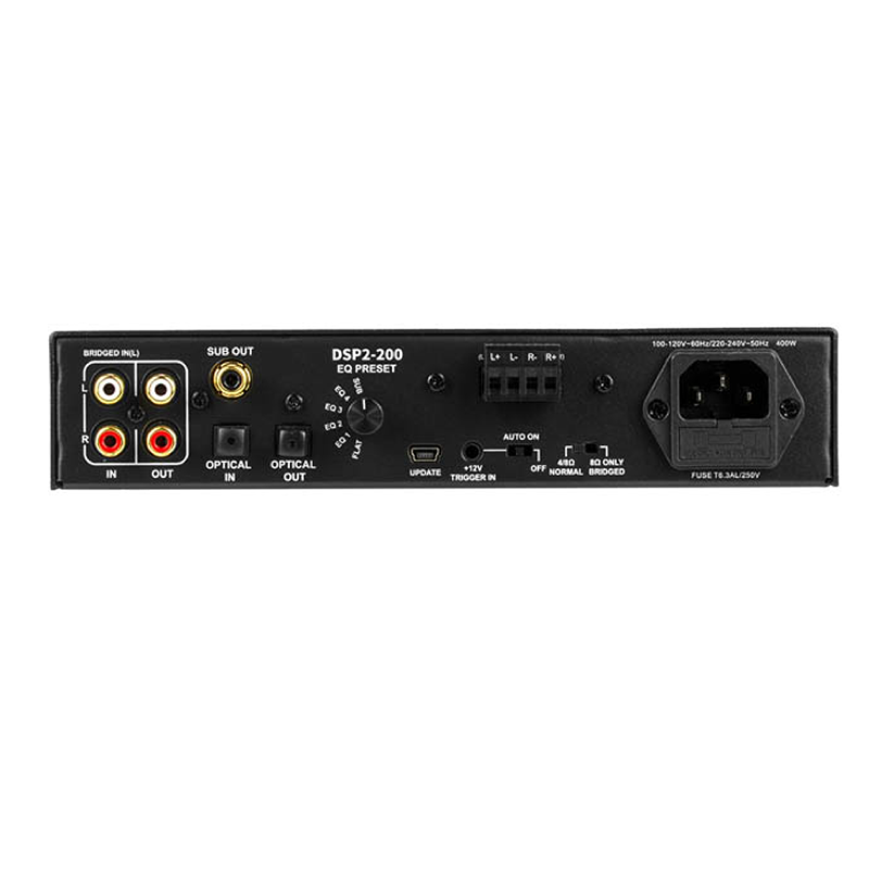 DSP2-200 zapewnia dużą moc w kompaktowej obudowie. Dzięki łatwemu w obsłudze pokrętłu do sterowania DSP oraz mocy 200 W na kanał, idealnie sprawdza się w systemach ogrodowych (8 Ω), subwooferach oraz w odsłuchu stereo.